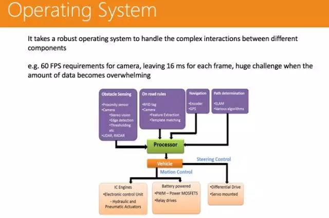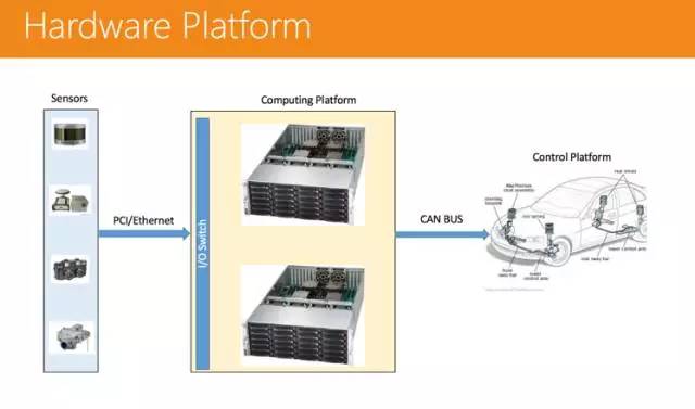 单一主节点,很容易整体崩溃。(解决方案:可以用 Zookeeper 机制来做,设置多个主节点。) 通信非常低效。(解决方案:可以用共享内存的方法来做。) 不是很安全,比如开一个恶意节点不断去损耗资源,很容易造成整体系统的崩溃。(解决方案:这个问题可以使用 Linux Container 的技术来解决。)硬件平台当然也是不可或缺的。其前端有很多传感器,信号传输进来后,有一个计算平台进行接收,处理完成后再通过 CAN-BUS,把控制信号传给车辆控制系统。