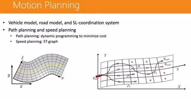 有了全局的路径规划以后,我们就需要进行行为决策。因为道路场景非常复杂,可以分成几十个不同的场景——左右车道、丁字路口等等,需要做场景组合决策。然后是动作的规划,包括加速、减速、转向等等,速度规划主要使用了 ST-graph 工具来做,路径规划主要是动态编程来实现。