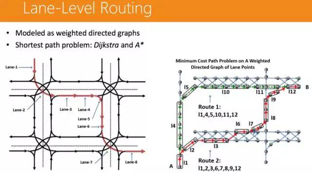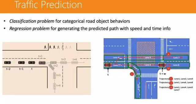 交通预测其实可以分成两个问题:一个是分类问题,另一个是回归的问题。分类问题要了解的是行人到底是过马路还是不过马路,回归问题就更复杂一些,如果行人是过马路,那么针对其过马路的速度是多少,需要做一个预测。 路径规划也是比较有趣的,因为这对无人车来说是一个比较特殊的问题,因为对于普通的车辆来说,只要知道这是哪条路就行了,而不需要知道这是哪一条车道。