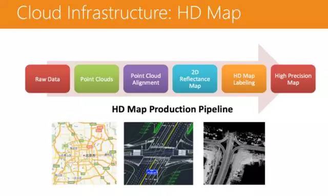 第二个是高精地图的制作。这是个很复杂的工作,首先是裸数据,然后从裸数据得出一个点云的数据,点云和点云之间要做一个对齐,对齐之后要把反射率的数据填到里面,然后再加一些语义的信息等。用分布式平台来做高精地图的生产,最大的计算量部分集中在点云的生产和对齐上,用异构计算可以很好地完成这些作业。