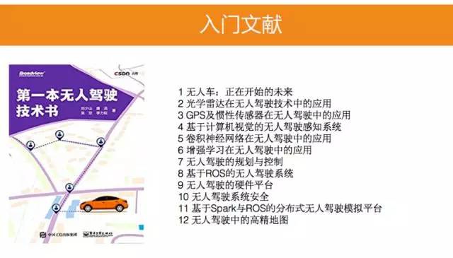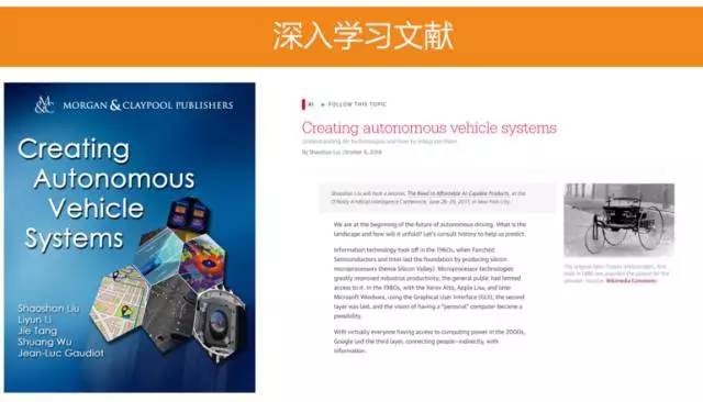 在有了入门的知识后,大家会对整个无人驾驶的技术框架比较了解,这个时候就需要更深入的了解每个技术点。为了让读者更深入了解无人驾驶技术,我们花了很多时间梳理了当前无人驾驶使用到的技术点,在美国出版了《Creating Autonomous Vehicle Systems》,这本书被 IEEE 推荐为无人驾驶教材,已经被美国多个大学的图书馆收录。这本书与《第一本无人驾驶技术书》最大的不同是每个技术点我们会比较深入的去解释,还会提供许多论文的引用,当读者对某个技术点特别感兴趣时,有足够的文献让读者去深入研究。