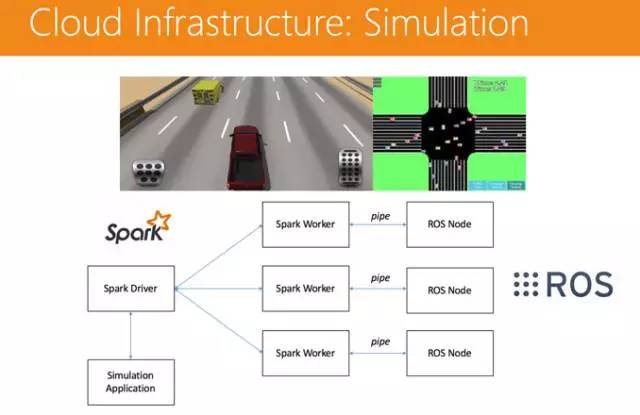 首先是模拟计算。比如你新开发了一个程序,想要试试新的算法是不是好用,但是不可能每次都实车验证,因为成本高,而且覆盖的场景很少。所以一般采用的是模拟计算的方式:游戏平台和真实数据回放,更多是采用后者的形式。这里有一个问题,单机回放必须要回放实际的数据,比如谷歌无人车累计有 8 年的数据,如果单机计算需要很长时间,这显然不可取。所以这里采用了 Spark Driver 的系统,可以并行处理,把作业分发下去,通过 Linux pipe 把每一个 ROS Node 节点打出来做一个回放,数据再回收到 Spark Driver 里去。只要给的节点够多,几十分钟就可以验证一套算法。