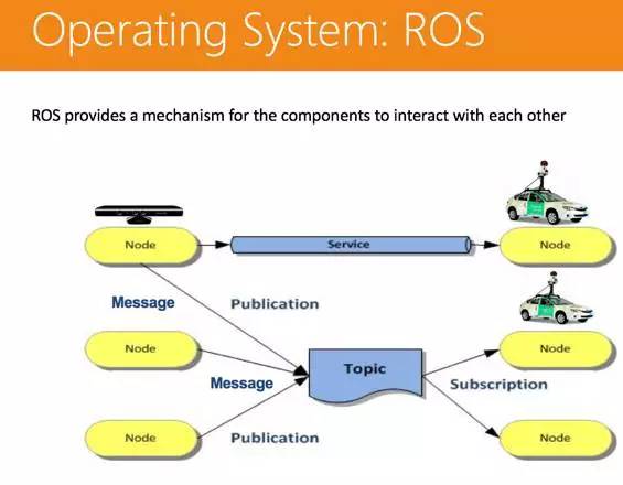 首先我们需要一个操作系统来管理这么多复杂的工作,现在大部分厂家用的都是 ROS——机器人操作系统,当然都做了一些个性化设计。这是一个信息传递的系统,可以通过点对点的传输形式或是广播的形式来做信号传输的动作。
