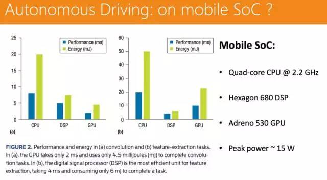 一年前我们探索过一个好玩的课题,如果用一个手机平台,是否可以支撑起无人驾驶的作业?于是我们使用手机平台,实现了一些比较简单的无人驾驶功能,主要是用视觉来做。下图显示了一个面向基于视觉的无人驾驶驾驶的移动 SoC 系统组成。在这个移动 SoC 实现中,我们利用 DSP 处理传感器数据,如特征提取和光流;我们使用 GPU 完成深度学习任务,如目标识别;采用两个 CPU 线程完成定位任务以实现车辆实时定位;我们使用一个 CPU 线程实现实时路径规划;使用另一个 CPU 线程进行避障操作。如果 CPU 尚未被全占有,多个 CPU 线程则可以在同一 CPU 核心上运行。