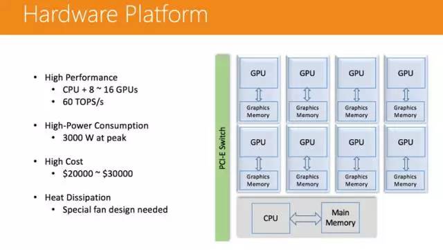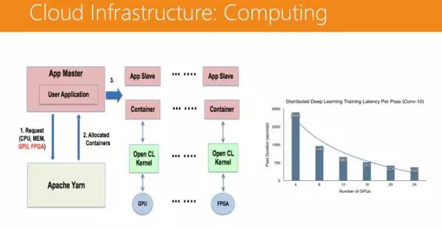 在计算层面,我们运用了 Apache Yarn 这个分布式系统管理器通过 Spark 把作业分发下去,每个 Spark 的节点都有多个容器(Container),容器上会跑一些 OpenCL 的 Kernel,OpenCL 可以跑在 GPU 上,也可以跑在 FPGA 上。这个平台的可扩展性非常强,模型训练所需的时间会随着 GPU 数量的增加而线性减少。