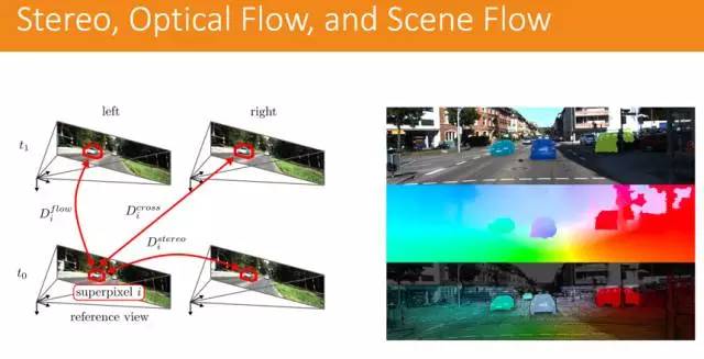 另外,就是我们所说的光流(Optical Flow),光流是针对 2D 图像来说的,如果说一个图片流到另外一个图片,都是 2D 的物体移动,那就用光流来做。如果是 3D 的物体流动,那我们就用场景流(Scene Flow),场景流在传统的方法就是使用的是 SGBM,利用的是双目成像的技术,把左图和右图合起来提取出空间的点,用光流在上面做,就能把场景的流动分析出来。