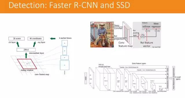 一个是 Faster R-CNN,它会将兴趣点框出来,然后再进行物体识别,找到是不是你想要识别的物体;另一个是更为快速的 SSD,也是将图中的物体识别出来。