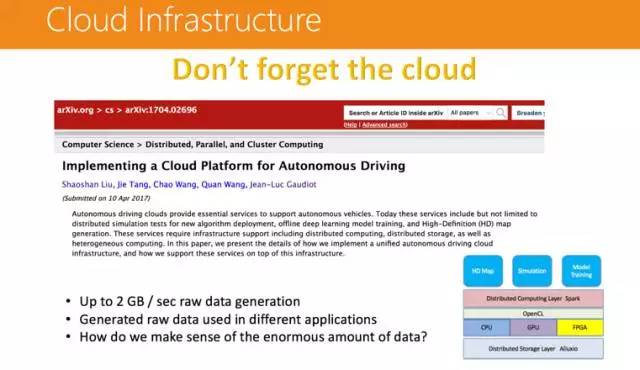 如今,很多人都关注无人驾驶的终端,而对于云平台没有给予足够的重视,实际上这块内容是非常重要的。无人驾驶车辆每秒最多可以产生 2GB 的裸数据,怎样利用这大量的数据去帮助无人驾驶做得更好,怎么样去搭建一个云平台去更好地服务无人驾驶的作业,这是个很大的挑战。