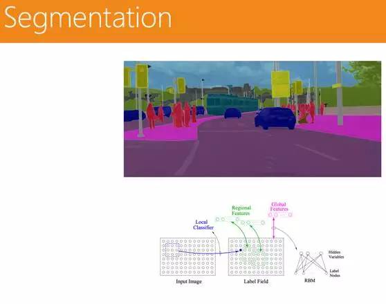 人行道是一个场景,道路是一个场景,在场景中对不同的物体进行分类,是一个很重要的问题。传统的方法是采用 CRF( 条件随机场),基本原理在于图像都是由像素点组成的,若两个像素点都比较像车,那就把二者连接起来,形成对车辆的识别。