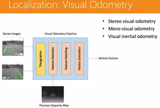 传统的做法是用双目进行视觉导航,方法如下:左右两个图进来,首先做一个三角成像,就可以得出空间中深度点的信息,每一个特征点都有描述,然后再将前后两帧图像的特征点进行比对,得出其位移的信息,大概能定位到车辆移动的距离。后续技术的发展,实现了单目视觉进行导航的功能,但是图像信息更新率有限——30-60 帧 / 秒之间。所以,为了更快速得到信息更新,还是要将 IMU 加上,就产生了 Visual inertial odometry 技术,可以得到很精准的位置更新。