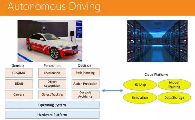 在车辆端,上层是算法模块,包括传感(如何更好的获取环境数据)、感知(如何更好的理解车辆周围环境,包括定位,物体识别,物体追踪)以及决策(在了解环境后如何更好的做出决策,包括路径规划,行为预测和障碍物躲避等)三个部分;下层则是操作系统和硬件平台。而在云端,则有一个无人驾驶的云平台,其上囊括了高精地图、模型训练、模拟计算以及数据存储等几块内容。