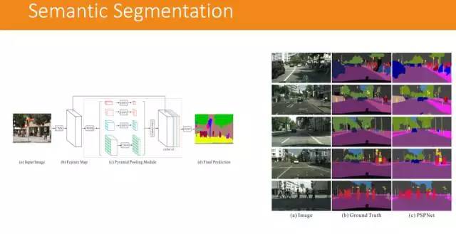 而在场景分类方面,运用深度学习的方法则使用的是另一种模型,被称为 PSPnet(语义分割)。这是金字塔型的场景分解模型,将一个场景不断地压缩,把类似的物体聚类,然后再做判断。