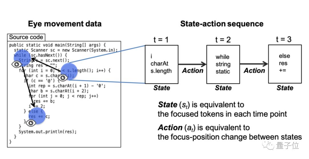 代码片段和编程环境被当做一系列token或关键字,智能体被限制专注于模仿程序员视觉注意力的特定子标记,作为输入当前状态并输出所需的操作。
