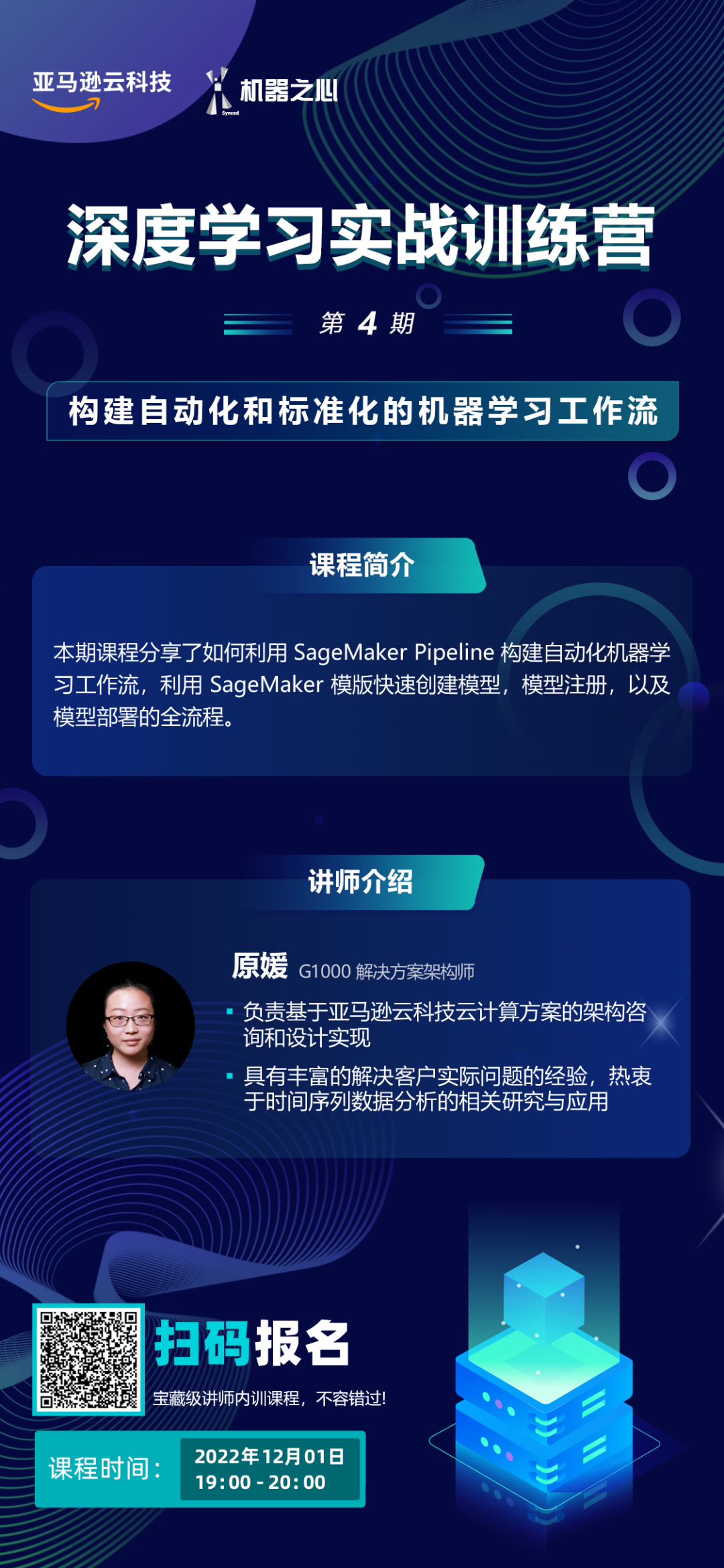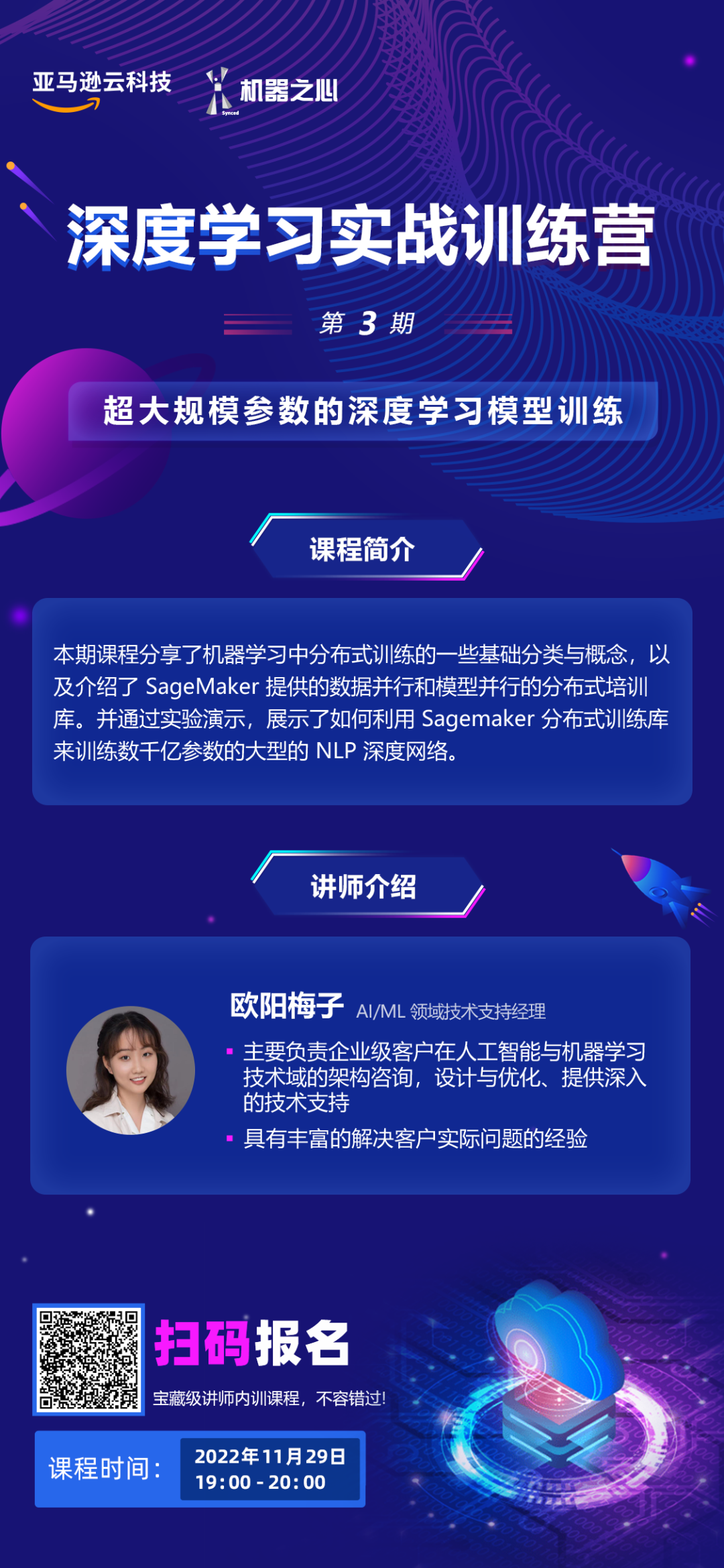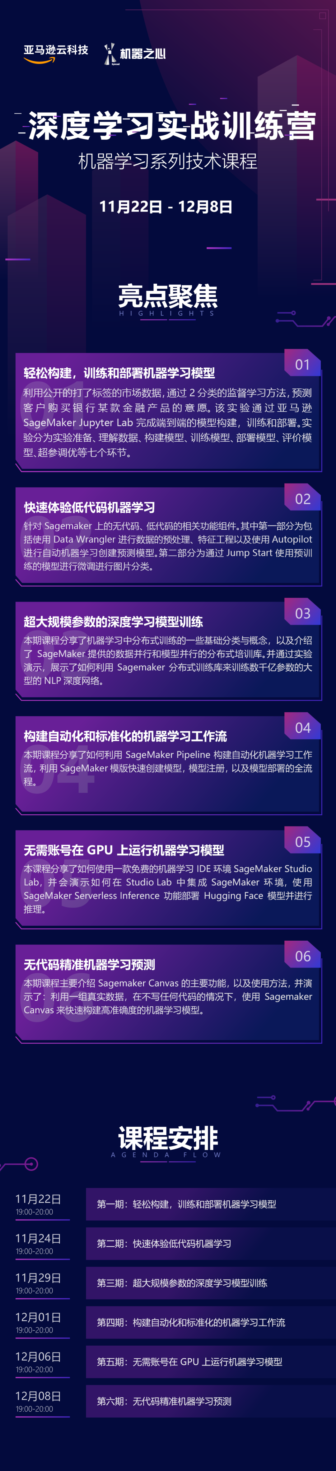 为了帮助开发者快速提升实战能力,机器之心联合亚马逊云科技开设了《深度学习实战训练营》线上实战营。实战营为期3周,共6次课程,还有6次课后作业,实战营期间讲师将在答疑群中随时解决同学的疑问,全程免费,欢迎希望上手实操深度学习的同学加入学习。