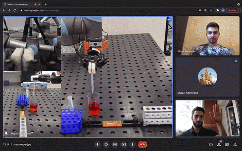 Video-Touch 系统的实际运用:单个用户在 Video-Touch 通话期间控制机器人。注意抓住试管时传感器的反馈 [源视频]
