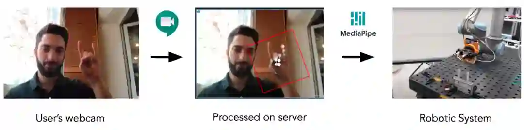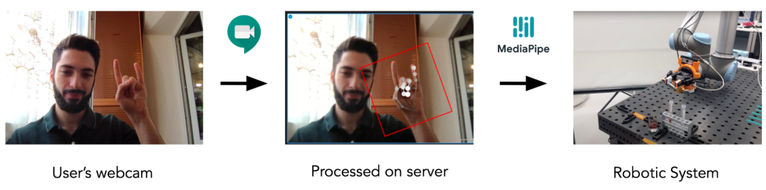 从方案中可以清楚地看出,用户在操作机器人时只需稳定的互联网连接和一个视频会议应用。所有的如屏幕捕捉、手部追踪、手势识别和机器人控制等计算,都可以在 Wi-Fi 与机器人连接的单独设备上进行(只是另一台笔记本电脑)。接下来,我们将对流水线的各个环节进行详细说明。