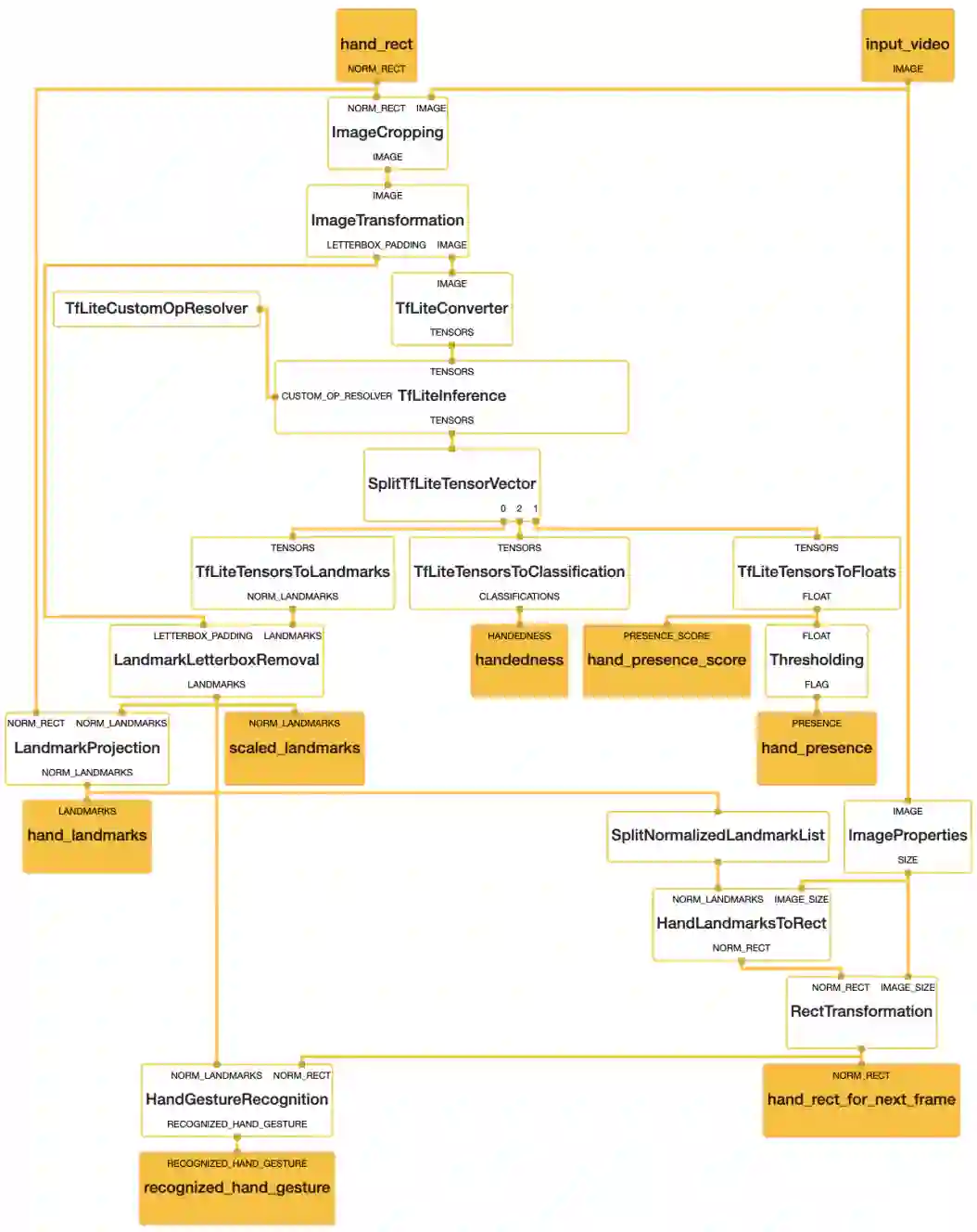 图 3:修改后的 MediaPipe 手部特征点 CPU 子图。注意手部姿势识别计算器(HandGestureRecognition calculator)