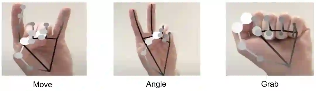 在上次发表文章的时候,我们有两个版本的手势识别实现。第一个版本如下图 3 所示,所有的计算均在手部姿势识别计算器内进行。计算器将特征点作为输入进行缩放,也就是说,这些特征点根据手的边界框大小(而非整个图像的大小)进行标准化。接下来,它会识别 4 种手势(另见图 4):“移动”、“倾斜”、“抓取”和“无手势”(论文中的“手指距离”手势是实验性内容,没有包括在最终演示版中),并输出手势类名称。尽管这个版本十分稳健实用,但它只是基于简单的启发式规则,如:“如果此特征点 [i].x < 特征点 [j].x,那么它是一个‘移动’手势”,而且对于手部旋转这类现实生活中的情况,此版本无法识别。