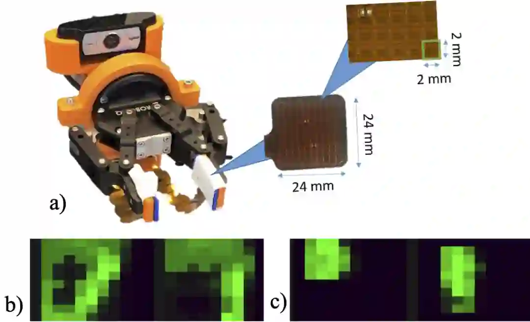 图 7:高保真触觉传感器数组:a) 数组在抓手上的位置。b) 抓手抓取移液管时的传感器数据。c) 抓手抓取试管时的传感器数据 [源发布文章]