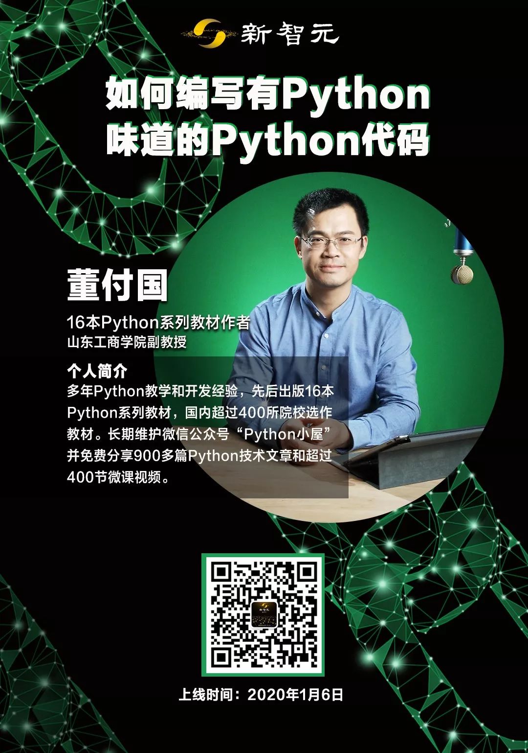 1月6日晚,16本Phthon系列教材作者董付国将在新智元小程序揭秘「如何编写有“Python味道”的Python代码?」,当天还有机会与大咖在线互动,答疑解惑,现在扫描下方海报二维码可抢占免费预约名额。