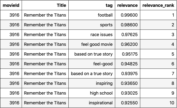 并不是每个标签都与电影相关,所以我们只需要保留最相关的标签。首先,我们可以根据相关评分对每部电影的标签进行排序。例如,下面是Remember the Titans的top10标签。请注意,相关性评分远远高于0.9,这表明它们是非常相关的标签。