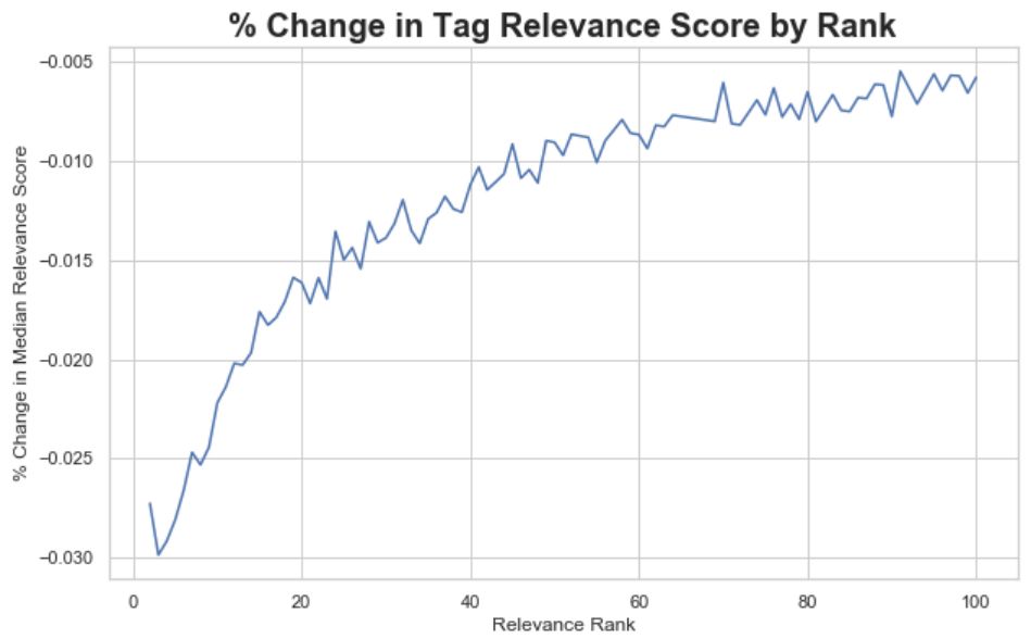 下面的图显示了从第1个标签到第100个标签的中值的变化百分比。当相关性得分开始变得更稳定时,我们看到在第50位附近有一个拐点。因此,我们可以选择N=50作为每个电影保留的合理数量的标签。注意,这是一个相当简单的“拐点方法”风格的方法,可以在以后进行优化。