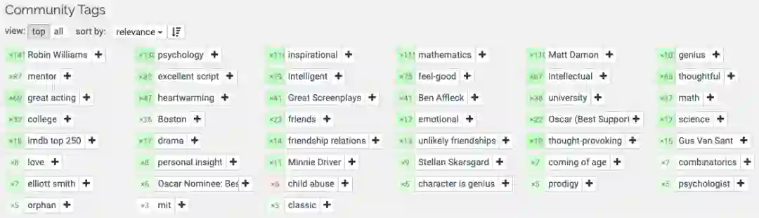 幸运的是,即使没有足够的观看数据,我们仍然可以建立一个像样的电影元数据推荐系统。这就是MovieLens的作用所在。MovieLens提供了一个公共数据集,其中包含每个电影的关键字标签。这些标签信息量很大。例如,看看Good Will Hunting的最重要的社群标签。