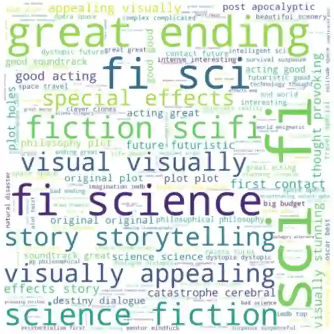 为了进一步说明Jaccard Index的有效性,请看下面基于和Interstellar相似的电影的标签频率的词云。在这里,我们可以看到哪些标签在相似性计算中更加突出(例如科幻小说,伟大的结局,反乌托邦的未来,哲学,大脑)。