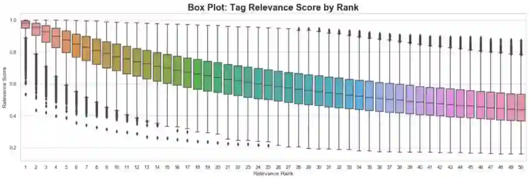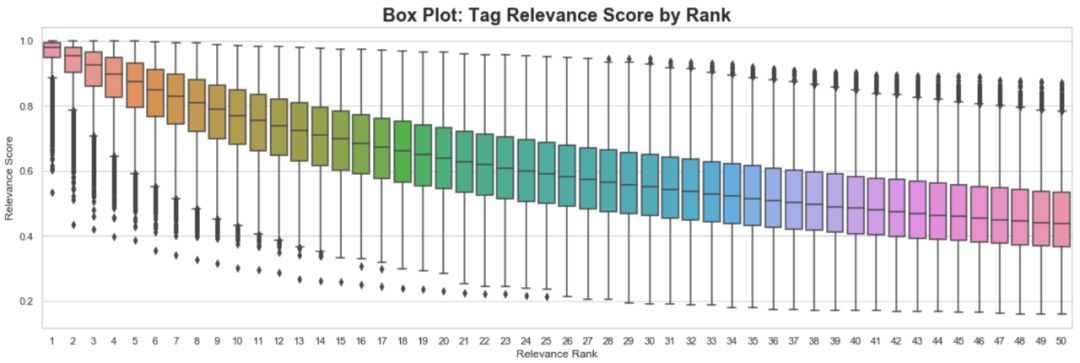 接下来,我们在下面的图中确认,电影的高排名标签往往具有较高的中值相关性得分。电影的排第一个的标签的中值相关度几乎是1。我们可以看到,当我们下降到第50位时,中值相关性得分逐渐下降。