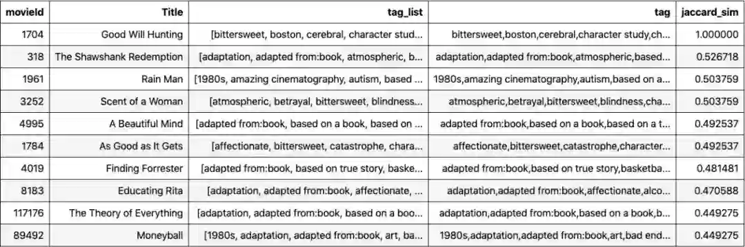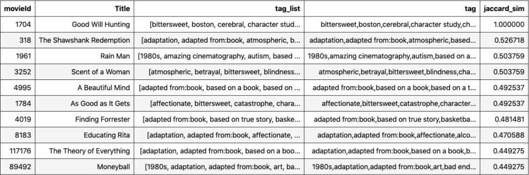下面是基于Jaccard Index的与Good Will Hunting相似的10部电影。对于Good Will Hunting的观众来说,这些建议似乎是合理的。注意,我在列表中包括了Good Will Hunting,以显示在比较电影本身时Jaccard Index=1。