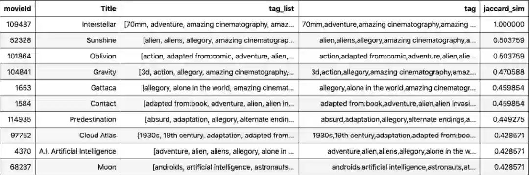 直观上,我们可以看出电影A与B更相似,而不是C。这是因为电影A和B共享两个标签(空间,友情),而电影A和C不共享任何标签。