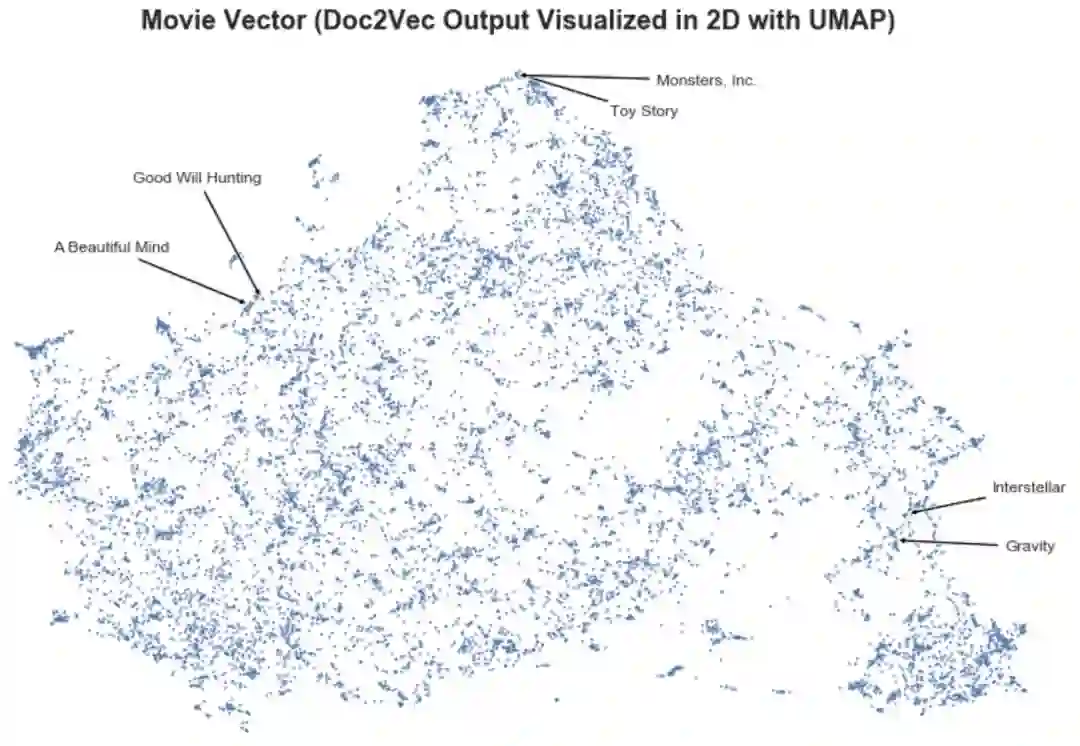 下面我用UMAP在二维空间上可视化电影向量,这是一种流行的非线性降维技术。我们可以看到,在这个向量空间中距离较近的电影更加相似(例如Toy Story和Monsters等等)。