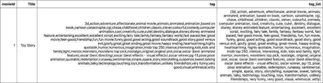 现在我们可以得到每个电影的前50个标签的列表,我们将在下一节中使用它们。例如,Toy Story的前50个标签如下。