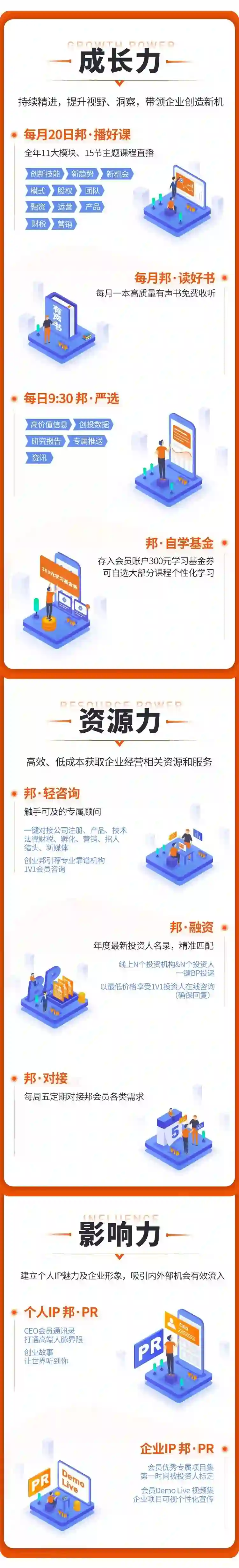 还有40+堂创业邦星际学院爆款课程;4000+创业人脉、社群资源对接;千元文档大礼包,12本有声书;免费参加创业邦全年3次峰会、投融资对接会;无限次参加全国12座城市线下所有活动(会员聚会、沙龙、公开课、路演活动....)