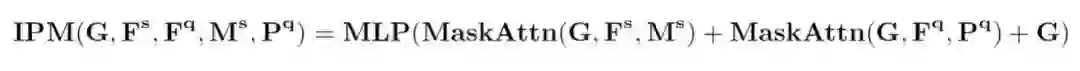 支持图像和查询图像输入到主干网络分别提取除支持特征和查询特征。查询特征在原型激活(PA)模块中经过简单的利用支持图像原型进行激活后,分割成一个初始预测掩码,并将该掩码和激活后的查询特征作为中间原型挖掘Transformer层的一个输入。同时,将支持特征、支持图片掩码和随机初始化的一个中间原型也做为第一层中间原型挖掘Transformer的输入。在中间原型挖掘Transformer层中,首先进行掩码注意力操作。具体来说,计算中间原型与查询或支持特征之间的相似度矩阵,并利用下式仅保留前景区域的特征相似度矩阵: