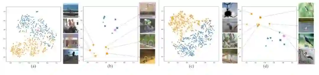 在图1中,展示了一些支持样本原型和查询图像原型的分布。从图中可以观察到,对于与查询图像相似的支持图像(在右侧标记为“相似支持图像”),它们的原型在特征空间中与查询原型接近,在这种情况下匹配网络可以很好地工作。然而,对于与查询相比在姿势和外观上具有较大差异的支持图像(在左侧标记为“多样化支持图像”),支持和查询原型之间的距离会很远。在这种情况下,如果将支持原型中的类别信息强行迁移到查询中,则不可避免地会引入较大的类别信息偏差。