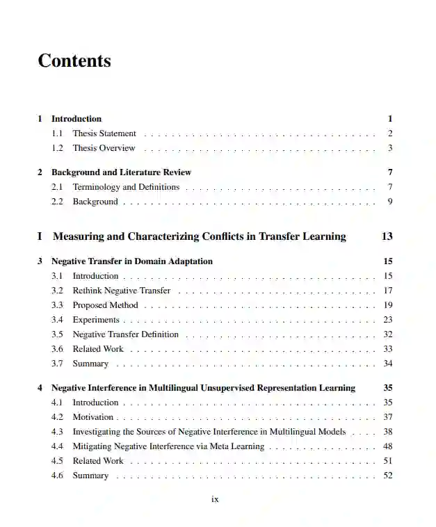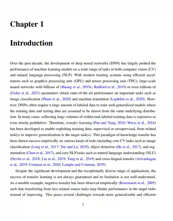 传统的机器学习范式在单个任务上训练特定任务模型,已经在许多领域(如计算机视觉和自然语言处理)取得了最先进的性能。为了使机器学习模型具有更广泛的适用性,迁移学习旨在适应从源任务中学习到的知识,以提高在其他目标任务中的表现。然而,现有的迁移学习范式还有待进一步研究,因此我们对其潜在的局限性、潜在的机制以及实现更智能迁移的解决方案的认识有限。特别是,当知识从一个不太相关的来源转移时,可能会对目标性能造成负面影响,这种现象称为负转移。然而,负迁移的原因尚不明确,负迁移如何影响模型的泛化和样本效率也不清楚。在这篇论文中,我们的目标是彻底描述和解决机器学习模型中的负迁移,我们仔细研究了流行的视觉和自然语言处理设置中的负迁移,收集了其原因的见解,并提出了提高泛化和样本效率的解决方案。本文由三个部分组成。第一部分对当前迁移学习模型中的负迁移现象进行了系统的分析。我们在领域适应和多语言自然语言处理模型中正式描述了其条件,并证明任务冲突是负迁移的一个关键因素。在第二部分,我们提出了各种对齐方法,通过更好的对齐表示和梯度解决上述任务冲突,增强可转移模型的泛化。最后,在第三部分,我们探索了有效样本迁移学习算法,使用较少的训练和/或校准数据来缓解负迁移。本文的主要贡献包括对迁移学习中的负迁移问题提出了新的见解,提出了一系列实用的方法和算法,提高了模型的泛化和效率。