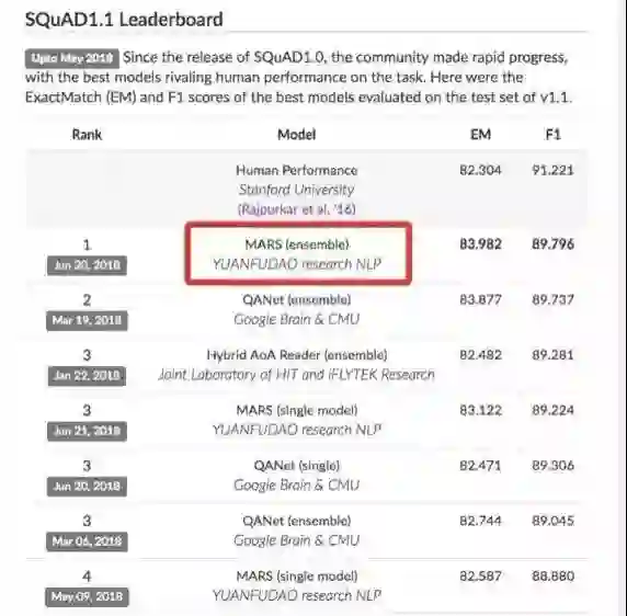 近日,中国在线K12教育机构猿辅导登顶SQuAD,排在其后的不乏谷歌、微软、百度等互联网科技巨头。SQuAD是斯坦福大学发起的机器阅读领域顶级赛事,主要测试机器对文本的理解能力,也就是机器阅读能力。今年互联网女皇的报告就是引用的SQuAD排名来分析AI行业的发展情况,可见该赛事在AI领域的影响力。