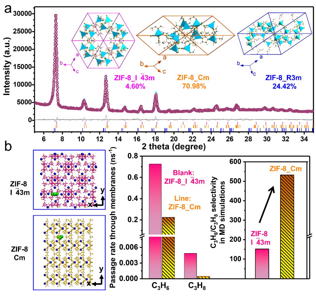 图4. a)合成时间为20分钟的ZIF-8膜的XRD精修结果图,其中膜的主要成分为偏刚性的ZIF-8_Cm相,而非柔性ZIF-8_I43m相;b) 刚性ZIF-8_Cm相膜和柔性ZIF-8_I43m相膜对丙烯丙烷分离的动力学模拟结果图。