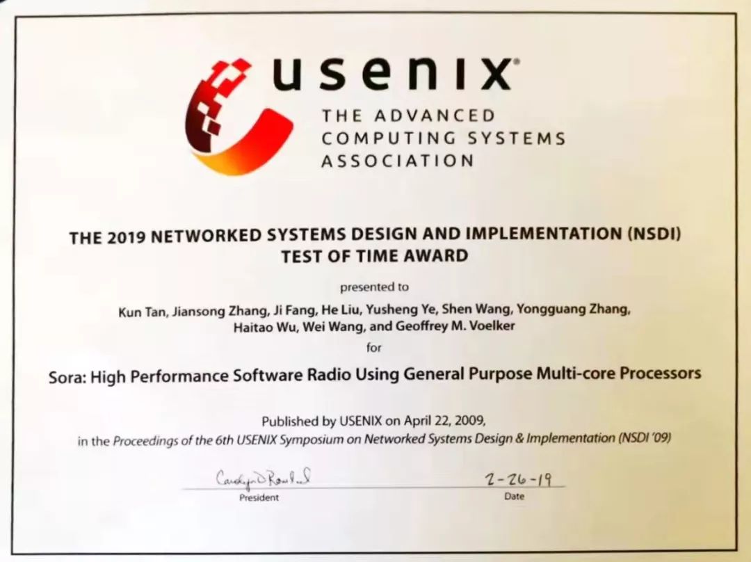 十年前,Sora项目的推动者和该论文的作者之一,时任微软亚洲研究院无线与网络组负责人的张永光(现任微软研究院首席研究员,负责微软雷德蒙研究院网络云化研究)就曾表示,“我们不少研究项目是着眼于10年后的应用,这些研究成果未来可能从根本上改变工业界。”在NSDI 2019大会上,这句话得到了验证,时隔十年,Sora荣获了“时间考验(Test of Time)”奖,在系统领域能够获此殊荣的技术可谓凤毛麟角。