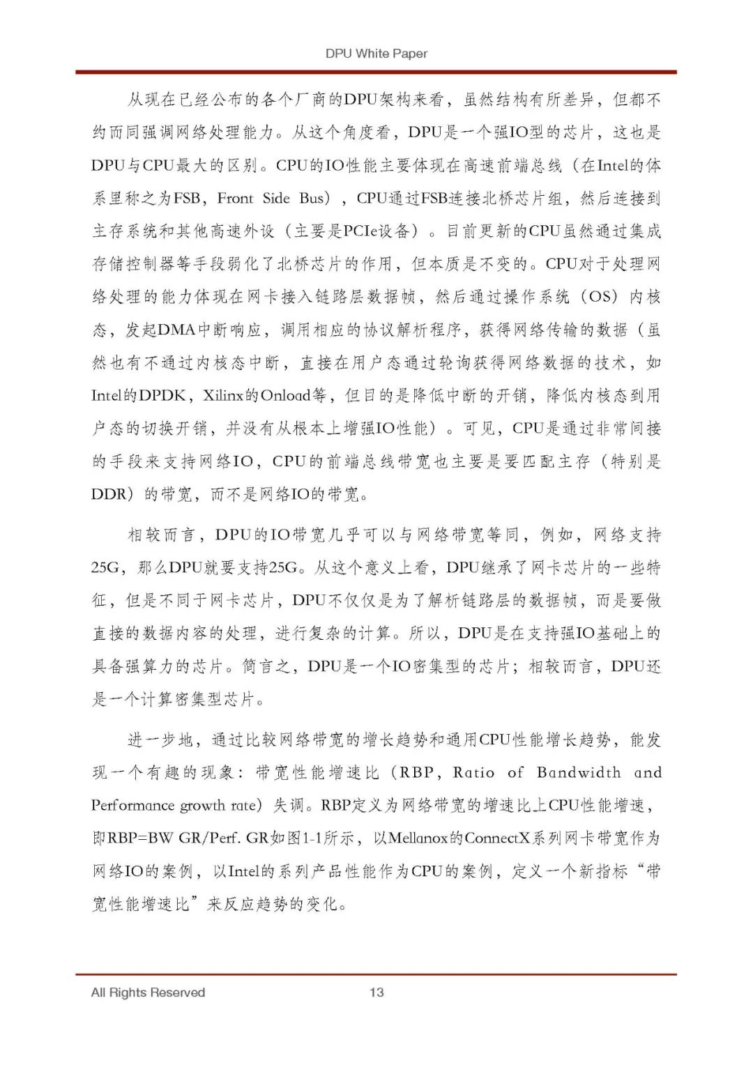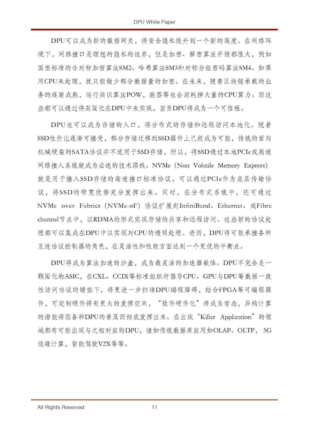 本白皮书将重点分析DPU产生的背景、技术特征、软硬件参考架构,应用 场景、并对目前已经公布的DPU产品做简要的比较分析,为后续DPU技术发展 提供必要的参考。本文的大体结构如下:第一部分介绍DPU的技术发展概况,首先对DPU做了一个基本的定义,然 后阐述了DPU发展的背景,并简要介绍DPU发展的历程,DPU在现有计算生态 中的角色,最后以DPU的产业化机遇作为总结。第二部分详细说明DPU的特征结构,对DPU的定位做了进一步阐述,然后 提出一种通用的DPU的结构模型。第三部分介绍DPU的应用场景,本文总结了三大应用场景:网络功能卸 载、存储功能卸载、安全功能卸载,这也是DPU目前最重要的三个应用方向。第四部分提出DPU开发的五层参考模型,包括设备层、操作层、计算引擎 层、应用服务层和业务开发层,既体现了DPU开发过程中的软硬协同,也充分 继承了通用软件栈的分层结构。第五部分概要介绍目前行业的已经发布或已经披露的DPU产品,虽然其中 绝大部分尚未到批量应用的阶段,各个竞品的优缺点也尚未得到市场的充分验 证,但是对于后续DPU研发具有重要的参考价值。第六部分展望未来DPU发展,并作为全文的总结。