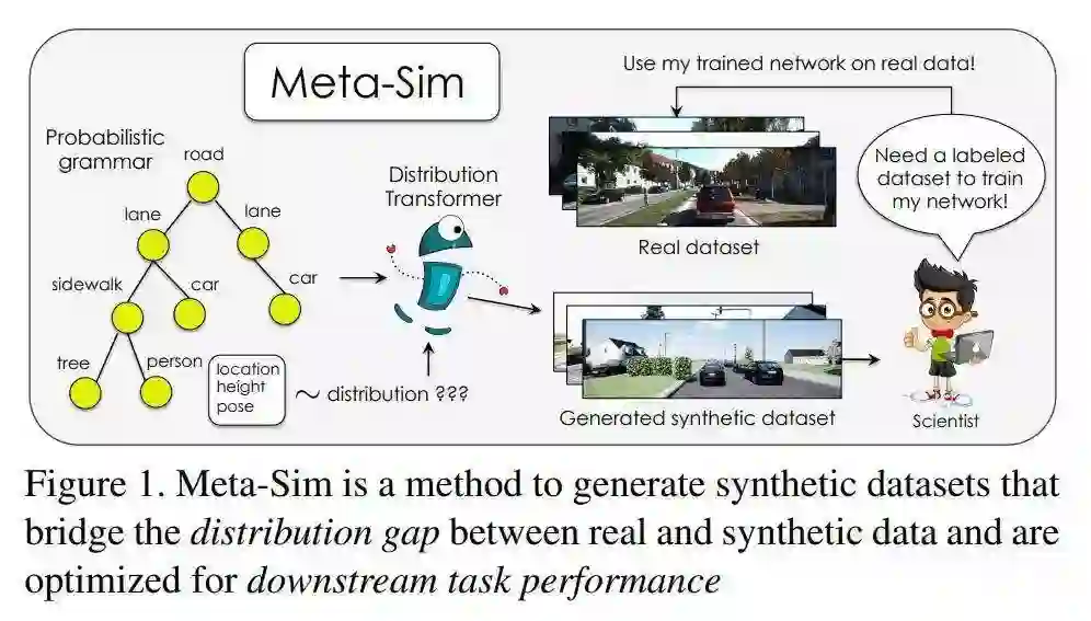 所以在论文《Meta-Sim: Learning to Generate Synthetic Datasets》中,作者们旗帜鲜明地提出,他们的研究目标是自动生成大规模标注数据集,而且这个数据集是对下游任务有帮助的(数据集中的内容分布能够符合目标使用场景)。作者们提出的方法是 Meta-Sim,它会学习到关于新合成的场景的生成式模型,而且可以通过一个图形引擎同步获得训练用的图形和对应的真实标签值。作者们接着用神经网络对数据集生成器进行参数化,使得它能够学会修改从场景内容分布概率中获得的场景结构图的属性,以便减小图像引擎输出的图像和目标数据集分布之间的差异。如果要模仿的真实数据集带有一个小的有标注验证集的话,作者们的方法还可以额外针对一个元目标进行优化,也就是说可以针对当前数据集任务的下游任务进行优化。实验表明,与人工设计的场景内容分布概率相比,他们提出的方法可以极大提高内容生成质量,可以在下游任务上定性以及定量地得到验证。更多具体细节可以参见论文原文。