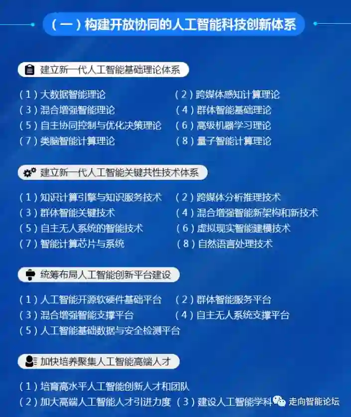 建设布局人工智能创新平台,强化对人工智能研发应用的基础支撑。人工智能开源软硬件基础平台重点建设支持知识推理、概率统计、深度学习等人工智能范式的统一计算框架平台,形成促进人工智能软件、硬件和智能云之间相互协同的生态链。群体智能服务平台重点建设基于互联网大规模协作的知识资源管理与开放式共享工具,形成面向产学研用创新环节的群智众创平台和服务环境。混合增强智能支撑平台重点建设支持大规模训练的异构实时计算引擎和新型计算集群,为复杂智能计算提供服务化、系统化平台和解决方案。自主无人系统支撑平台重点建设面向自主无人系统复杂环境下环境感知、自主协同控制、智能决策等人工智能共性核心技术的支撑系统,形成开放式、模块化、可重构的自主无人系统开发与试验环境。人工智能基础数据与安全检测平台重点建设面向人工智能的公共数据资源库、标准测试数据集、云服务平台等,形成人工智能算法与平台安全性测试评估的方法、技术、规范和工具集。促进各类通用软件和技术平台的开源开放。各类平台要按照军民深度融合的要求和相关规定,推进军民共享共用。