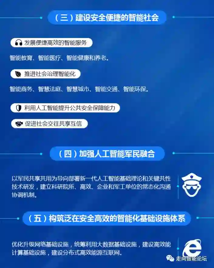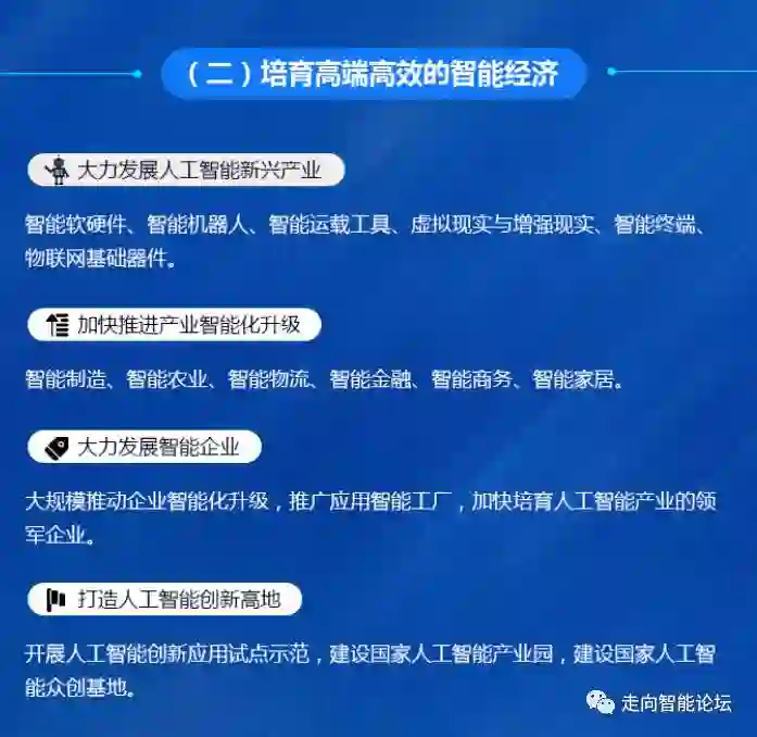 第三步,到2030年人工智能理论、技术与应用总体达到世界领先水平,成为世界主要人工智能创新中心,智能经济、智能社会取得明显成效,为跻身创新型国家前列和经济强国奠定重要基础。