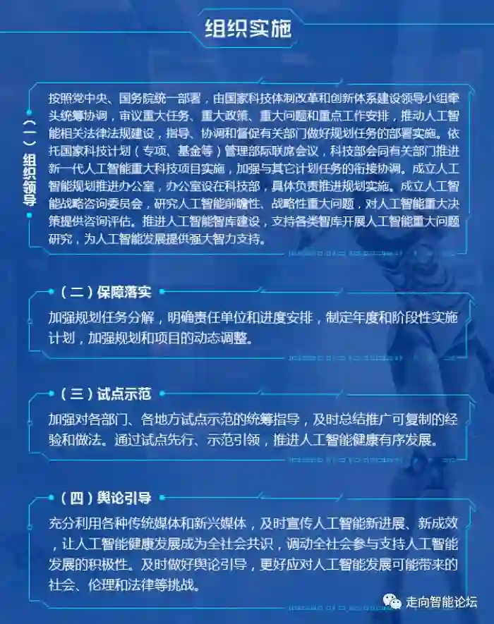 按照党中央、国务院统一部署,由国家科技体制改革和创新体系建设领导小组牵头统筹协调,审议重大任务、重大政策、重大问题和重点工作安排,推动人工智能相关法律法规建设,指导、协调和督促有关部门做好规划任务的部署实施。依托国家科技计划(专项、基金等)管理部际联席会议,科技部会同有关部门负责推进新一代人工智能重大科技项目实施,加强与其他计划任务的衔接协调。成立人工智能规划推进办公室,办公室设在科技部,具体负责推进规划实施。成立人工智能战略咨询委员会,研究人工智能前瞻性、战略性重大问题,对人工智能重大决策提供咨询评估。推进人工智能智库建设,支持各类智库开展人工智能重大问题研究,为人工智能发展提供强大智力支持。