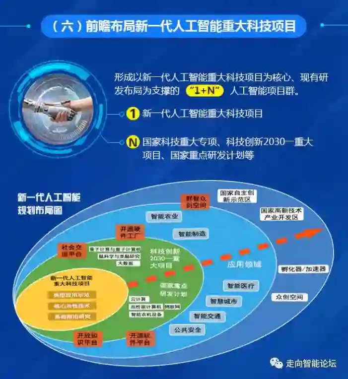“1”是指新一代人工智能重大科技项目,聚焦基础理论和关键共性技术的前瞻布局,包括研究大数据智能、跨媒体感知计算、混合增强智能、群体智能、自主协同控制与决策等理论,研究知识计算引擎与知识服务技术、跨媒体分析推理技术、群体智能关键技术、混合增强智能新架构与新技术、自主无人控制技术等,开源共享人工智能基础理论和共性技术。持续开展人工智能发展的预测和研判,加强人工智能对经济社会综合影响及对策研究。