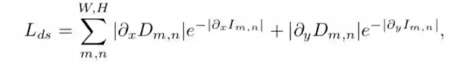 为了保证平滑的深度估计,本文也引入了深度平滑性损失函数L_ds,因此得到最终的损失函数L: