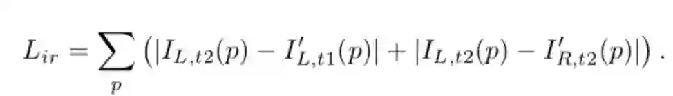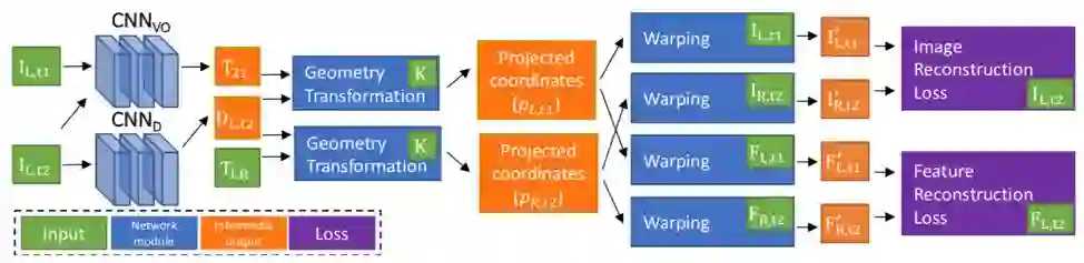 网络使用双目图片作为训练样本,其中包含时间图片对和双目图片对。本文通过两个综合函数f(.)变换得到参考试图。综合函数f(.) 融合了两个可以偏微分的操作(对极几何变换和图像变形)以方便ConvNet训练时的反向传播。变换图片重建的损失函数作为训练CNN_D和CNN_VO的损失函数:
