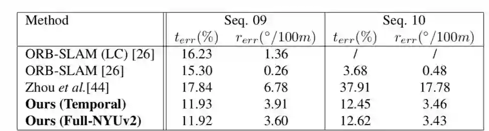 表2显示了深度估计的结果评价。图2展示了深度估计的一些结果。实验结果表明使用双目训练结果比使用单目的好。由于使用深度特征损失函数以及里程计网络中的图像变形,该方法可以得到合理的边缘。