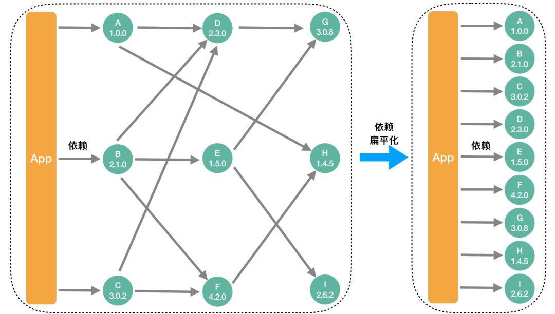依赖扁平化的核心思想是事先把依赖项以及依赖版本号进行显示指定,这样通过固定依赖项以及依赖版本就彻底去掉了组件依赖计算的耗时,极大的提高了项目构建速度。与此同时,依赖扁平化还额外带来了下面的好处: